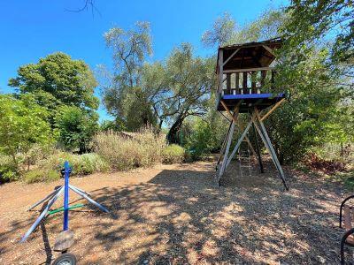 Ein Baumhaus im hinteren Teil des Gartens lässt Kinderherzen höher schlagen.